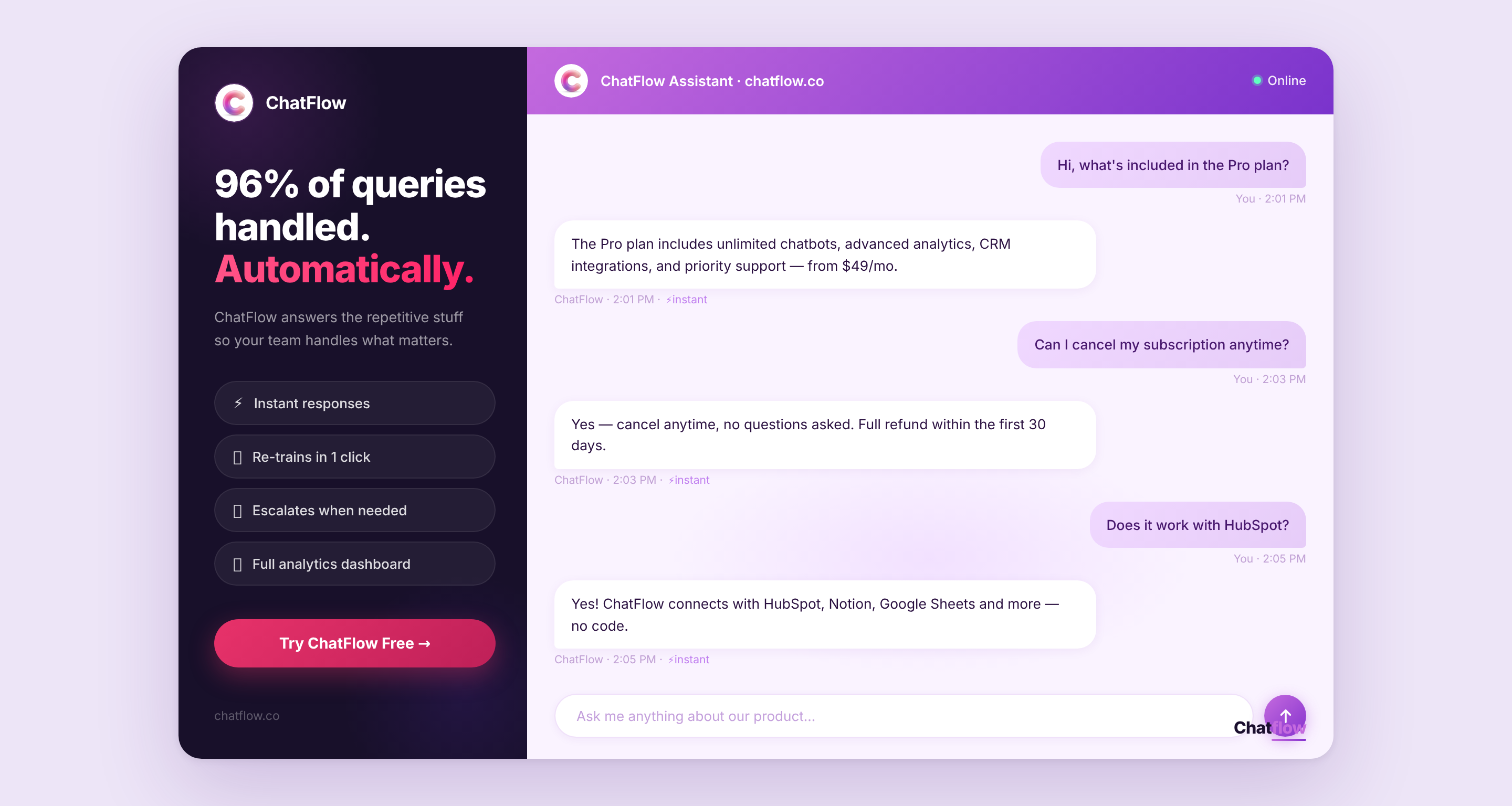 If your WooCommerce help desk is drowning in repetitive queries — order status, return policies, product FAQs — ChatFlow is built to handle exactly that, automatically, and without a single line of code.