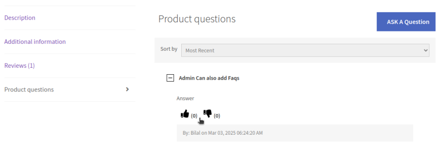 Allow your customers to ask product-related questions directly from the product page using the "Ask a Question" form. This lets shoppers inquire about product details, discount offers, or anything not covered in the FAQs, making it easy to communicate with the store admin.