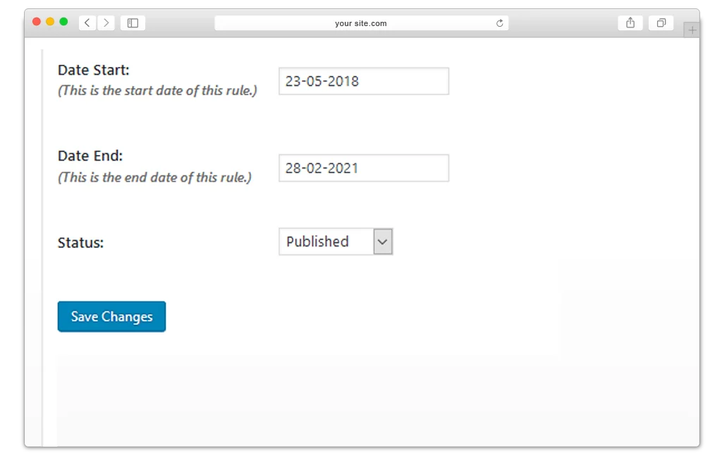 Geolocation WooCommerce lets you set time-based restrictions by selecting a start and end date. This way, you can temporarily block access to your website for certain users and automatically lift the restriction once the set period ends.