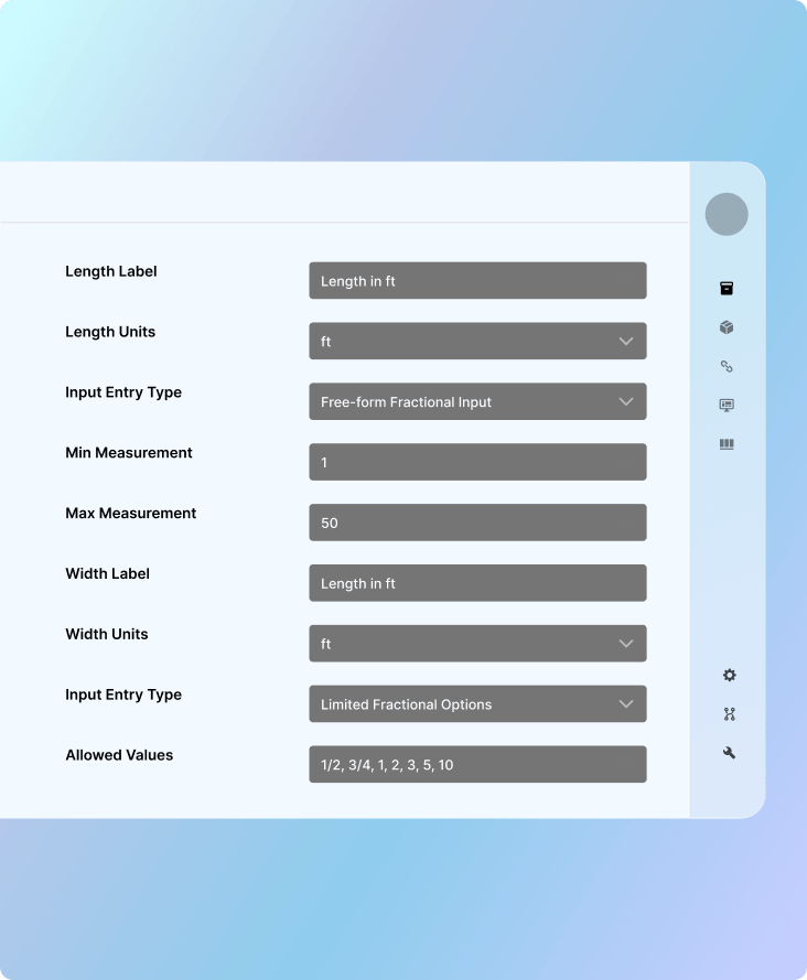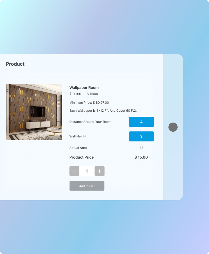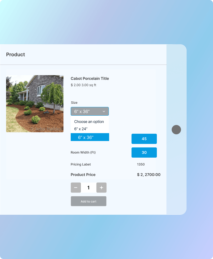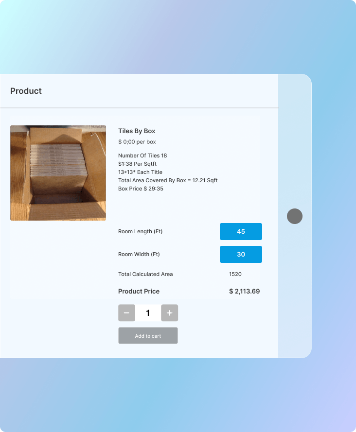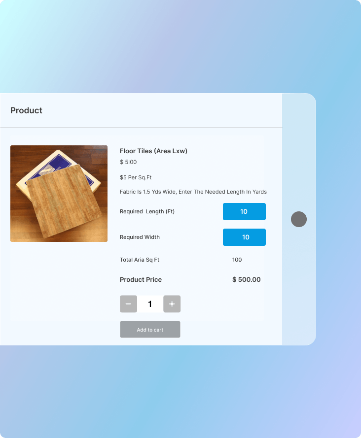 For simpler area-based pricing, you can display one input field for products sold by total area. It also supports units from square millimeters to square miles as set by the store.