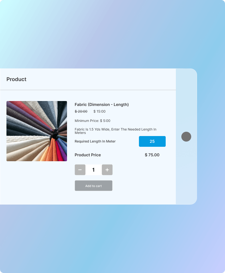 The WooCommerce price calculator plugin helps you sell products that are priced based on size, weight, area, or volume. Customers simply enter their required measurements, and the plugin automatically calculates the total price based on the rules set by you. You can also create pricing tables, offer quantity discounts, manage stock in measurement units, and set minimum or maximum purchase limits to control orders and inventory more efficiently.