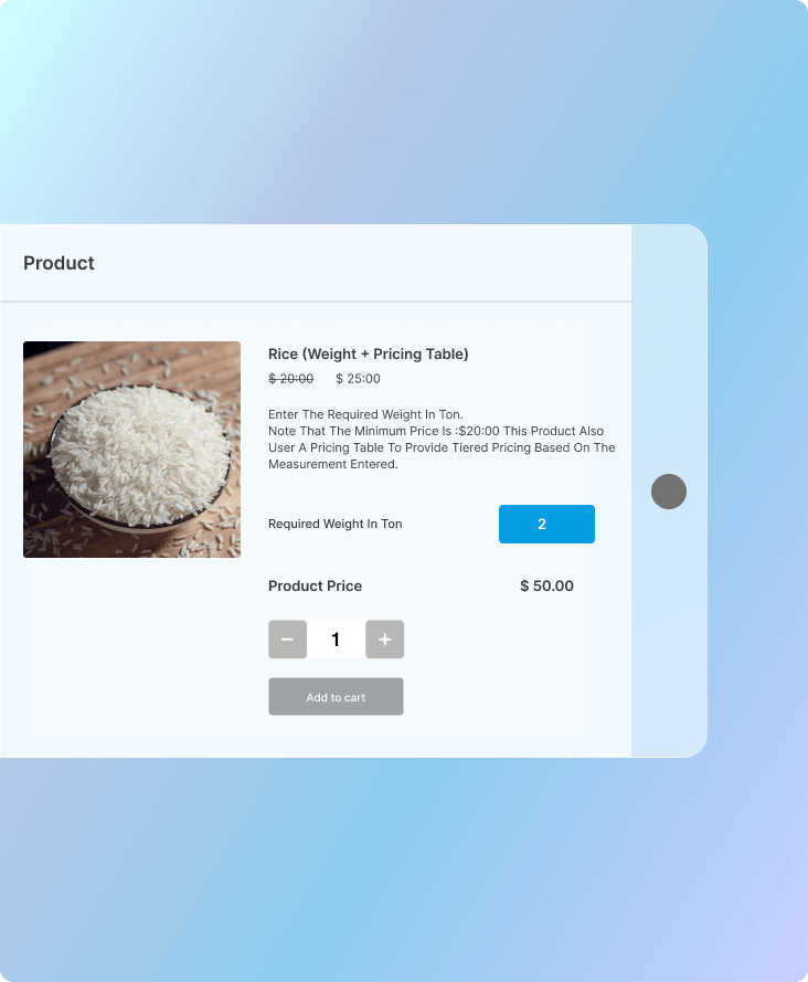 The WooCommerce price calculator plugin also lets you sell products based on weight, perfect for goods like rice, sugar, meat, or liquids. It supports weight units such as kilograms, grams, milligrams, ounces, pounds, and tons for pricing.