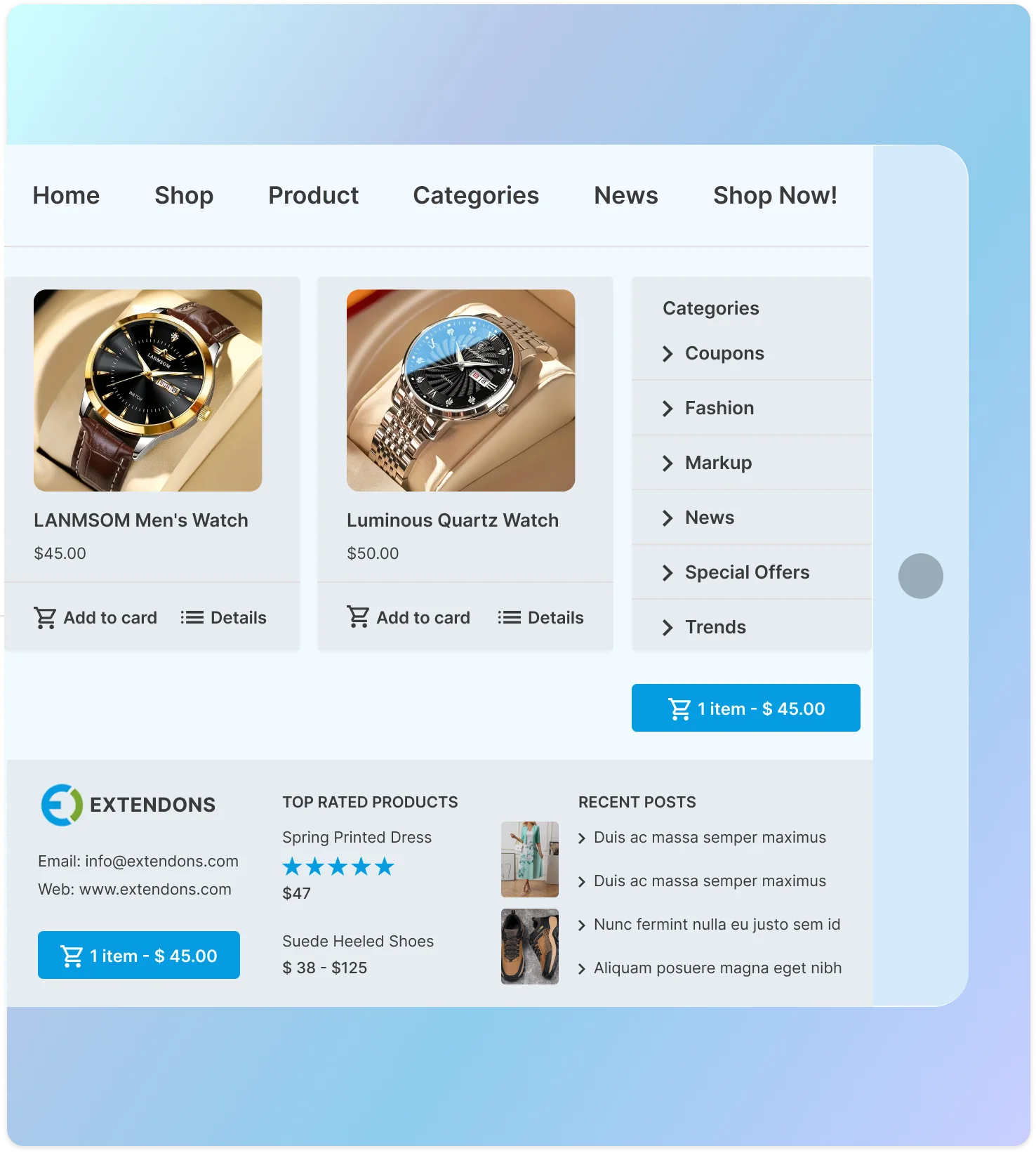 WooCommerce mini cart plugin lets you customize the cart button and place it anywhere on your site. Choose from multiple types of carts and display real-time updates allowing users to confidently continue shopping and reduce the likelihood of cart abandonment.